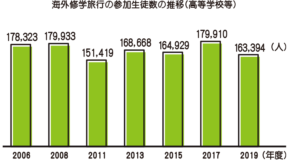 コロナ禍の前、海外修学旅行を経験した高校生は16~17万人超で、ここ数年の「数」の推移は横ばいだ。