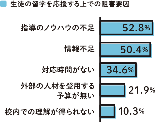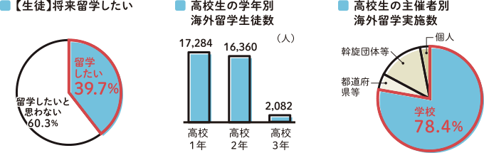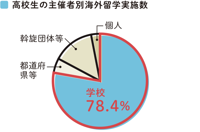 いずれにせよ、高校では学校単位の留学が全体の約8割を占めており、これからの世の中を見据え、学校単位の取り組みがさらに加速されることが期待されます。