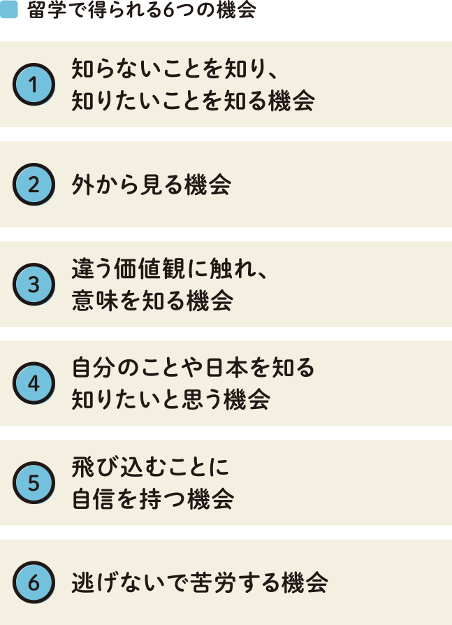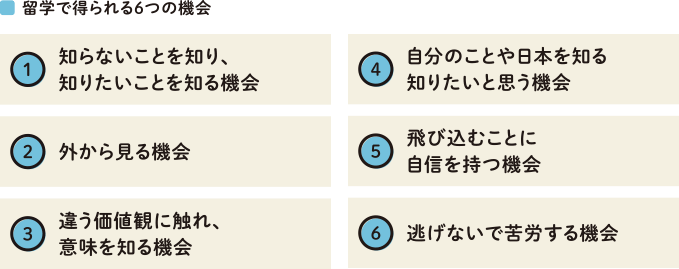 留学では、異なる価値観に触れたり、自分のことや日本を知りたいと思うなど、普段の学校生活では得づらい経験も含めて多くの機会を得ることができます。