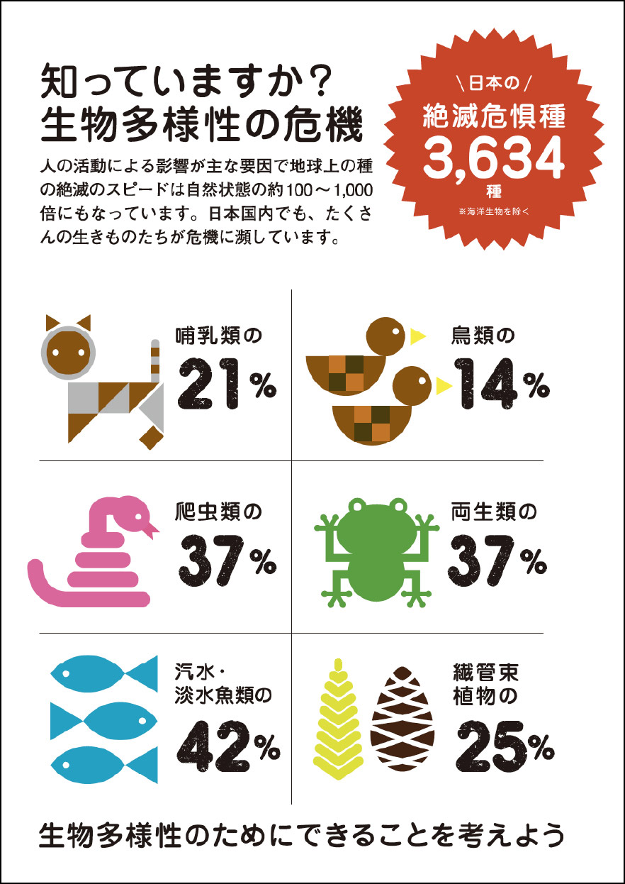 生物多様性とは、生きものたちの豊かな個性とつながりのことです。地球上の生きものは40億年という長い歴史の中で環境に適応して進化し、現在確認されている約175万種、まだ知られていない種類も合わせると3,000万種ともいわれます。これらの生命は一つひとつに個性があり、全て直接に、間接的に支えあって生きています。ところが、毎年4万種の生物が絶滅し、2万6000種もの野生生物が絶滅の危機にあります。