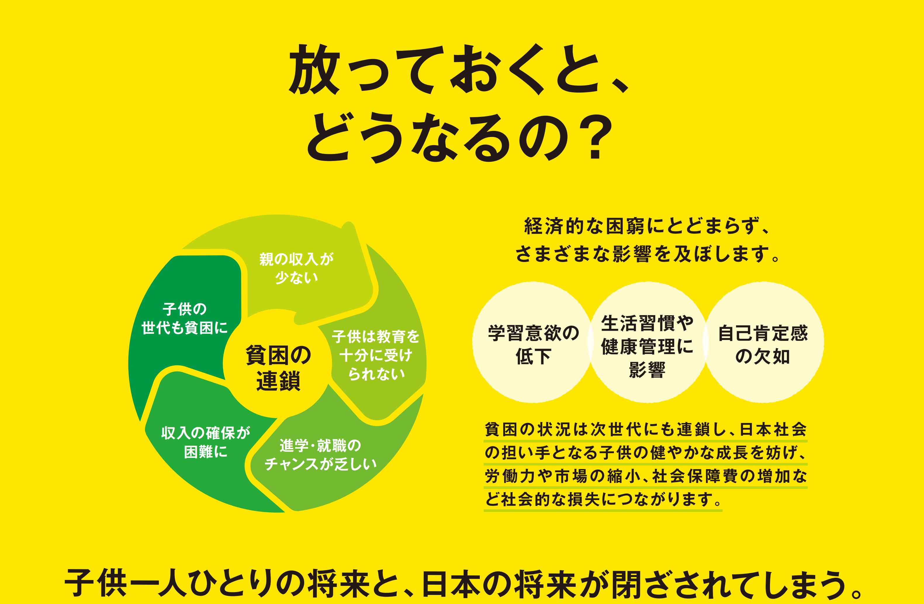 お金がないために、住む場所がない、食べるものが手にいれられないなどの人間らしい必要最低限の条件が満たされていない状態をいう絶対的貧困に対し、可処分所得がその国の中央値の半分未満であることを「相対的貧困」といいます。また、家庭の経済状態によって、受けられる教育の格差は、将来の機会の格差にまで繋がっていき、深刻な問題になっています。